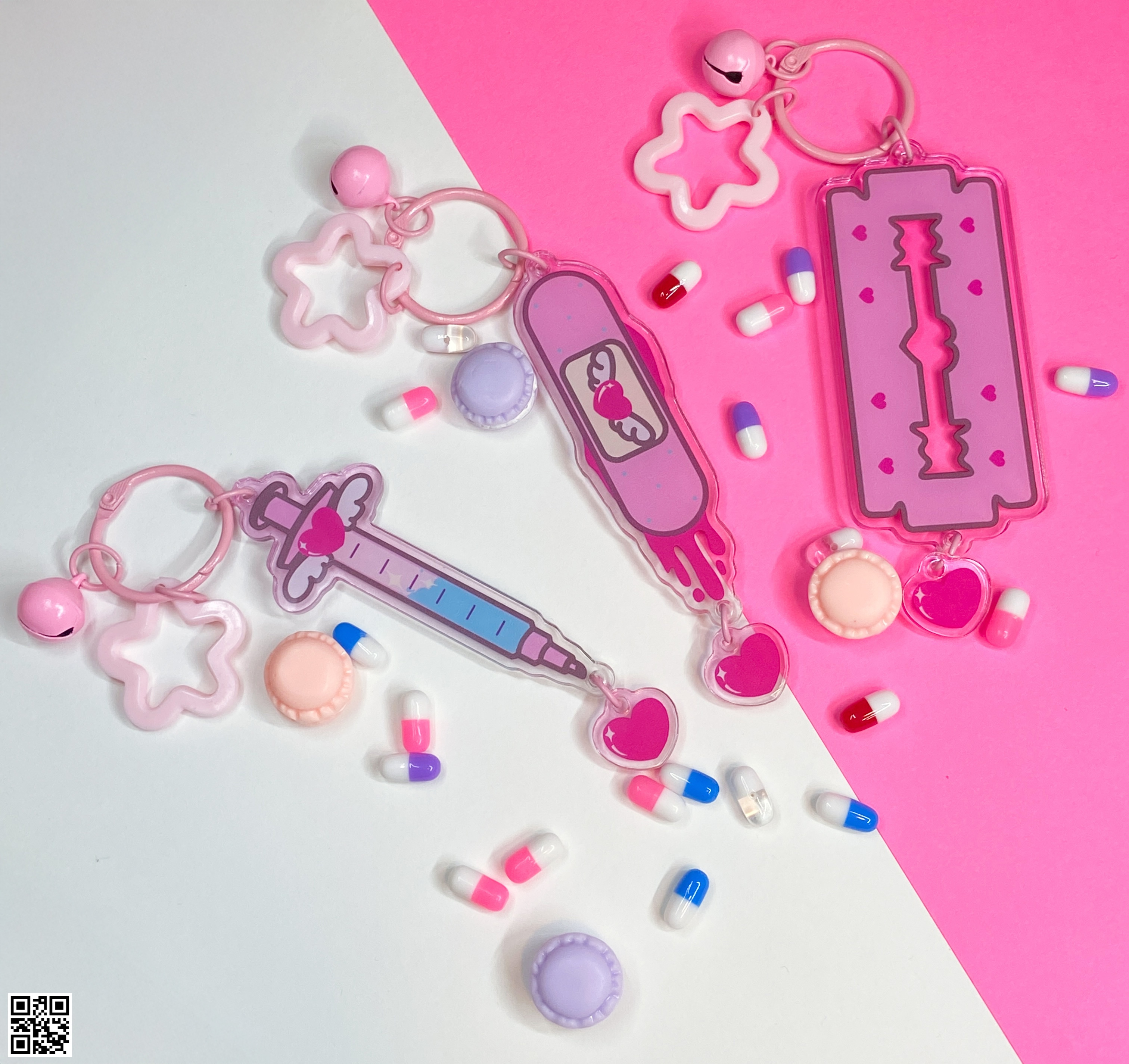 my 3rd series of original keychains!! :D I like yami kawaii a lot and Emocosine's song and MV "Cutter," and was inspired to make these! :D